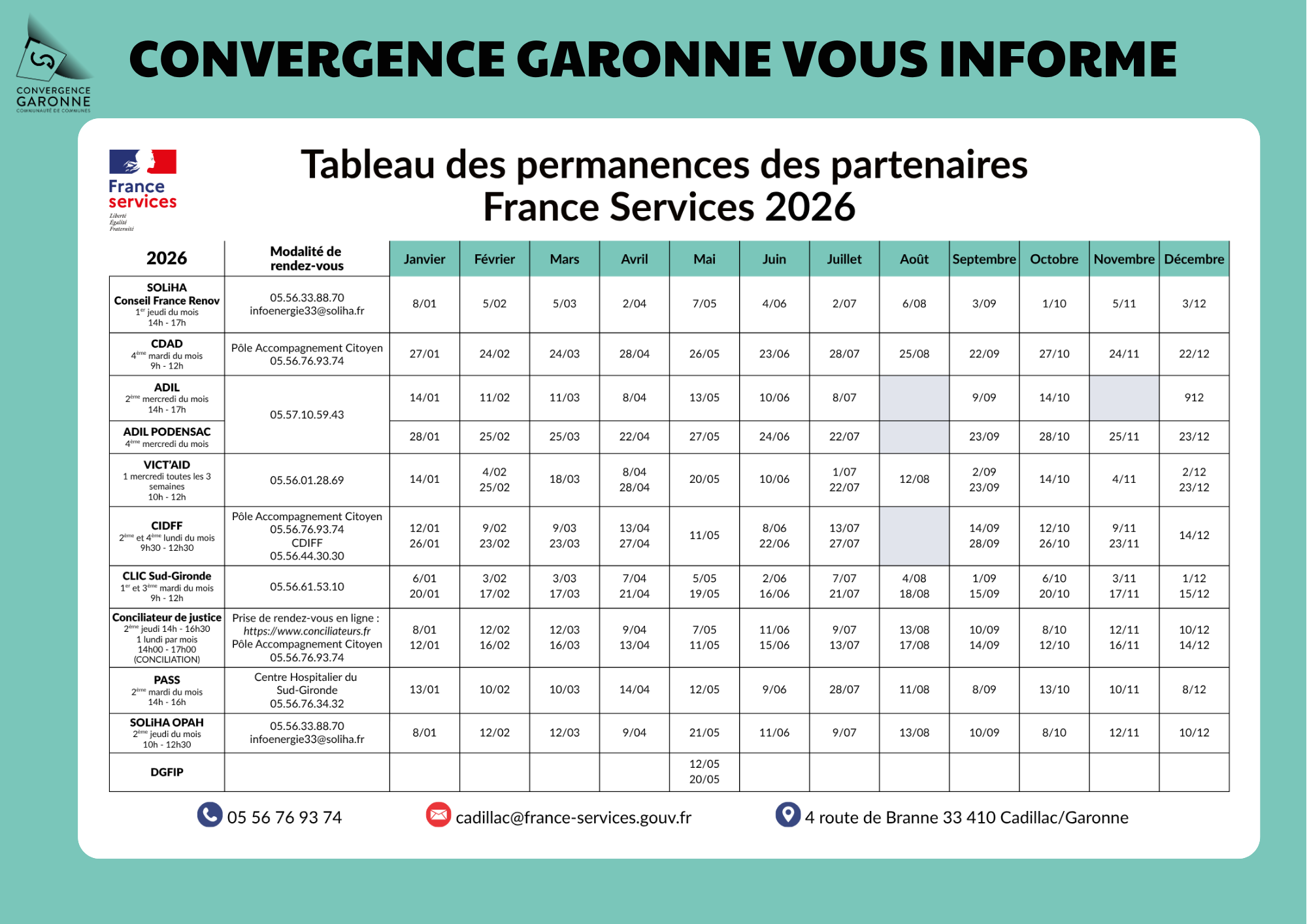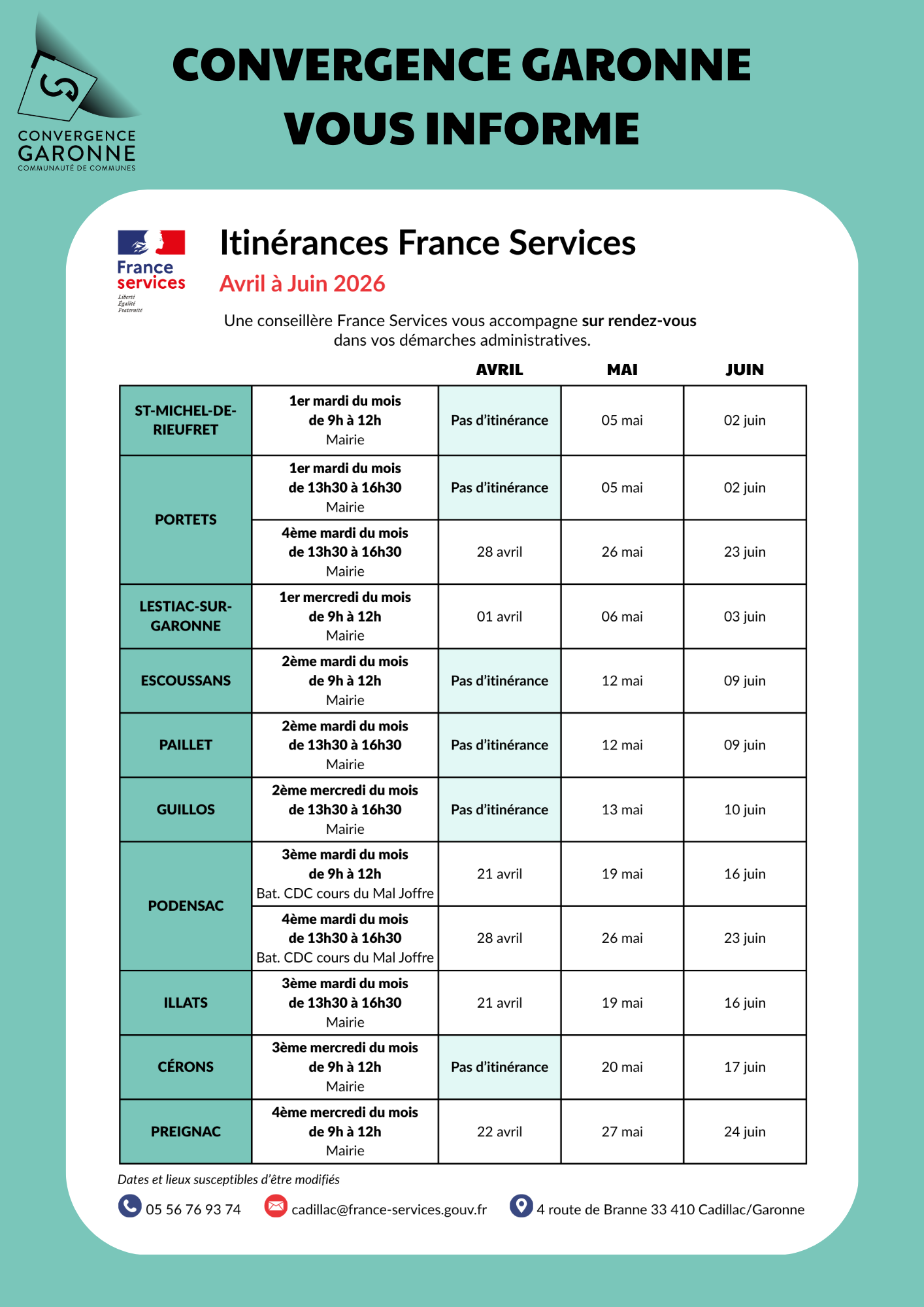 La vocation première de la Maison France Services est d’être au plus près des habitants et de faciliter l’accès aux services publics et aux droits. Des permanences itinérantes, sur rendez-vous, ont ainsi été mises en place. Ce sont 10 communes qui accueillent des itinérances permanentes (Lestiac-sur-Garonne, Paillet, Escoussans, Guillos, Saint-Michel-de-Rieufret, Illats, Podensac, Portets, Cérons et Preignac)